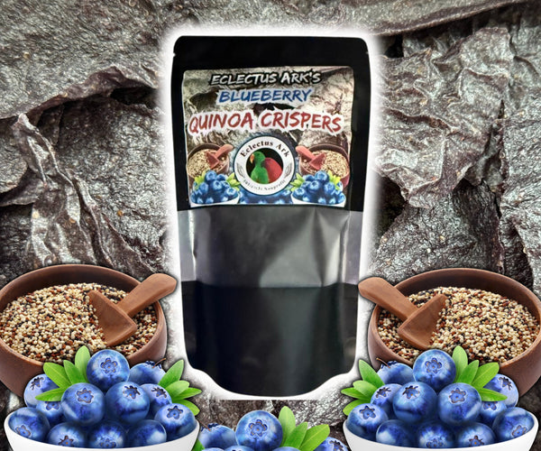 These are crunchy crisps made from cooked quinoa and pureed Blueberries - Great treats for all hookbills including Macaws, Cockatoos, Eclectus, African Greys, Amazons, Conures, Cockatiels, Lovebirds, Parakeets, Budgies, and more.