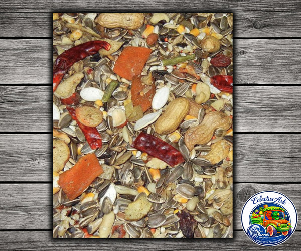 Sunflower, Safflower, Corn, Oats, Peanuts, Brazil Nuts, Cashews, Filberts, Pecans, Walnuts, Almonds, Milo, Pumpkin Seed, Peppers, Bananas, Apples, Papaya, Pineapple, Figs, Raisins, Dates, Cranberries, Oranges, Pears, Apricots, Veggie Chips (Carrots, Yucca, Potato, Zucchini, Squash, Taro, Green Beans, Corn), Wheat Germ Oil, Essential Vitamins & Minerals.
